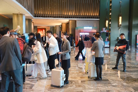 盛会期间,潇河新城酒店群化身为连接虚拟与现实的创意枢纽。我们迎接了《盛夏芬德拉》《家里家外》《暧昧失温》《禁欲大佬沦陷了》等多部热门剧集的人气演员,他们的到来不仅为酒店群落注入了无限的活力与魅力,更让酒店化身为“时尚片场”。众多演员现身酒店各个精美空间取景拍照,吸引了大量粉丝慕名而来,形成了热烈的互动氛围。粉丝们有序守候,只为与心仪的偶像进行短暂交流,构成了大会期间一道独特的风景线。
